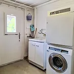 Les équipements de cuisine d'une propriété en front de mer Chalet Haus Am See By Interhome comprennent un réfrigérateur, un four et de la vaisselle, fournis dans un coin repas.